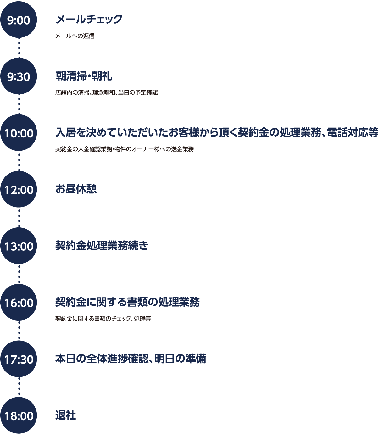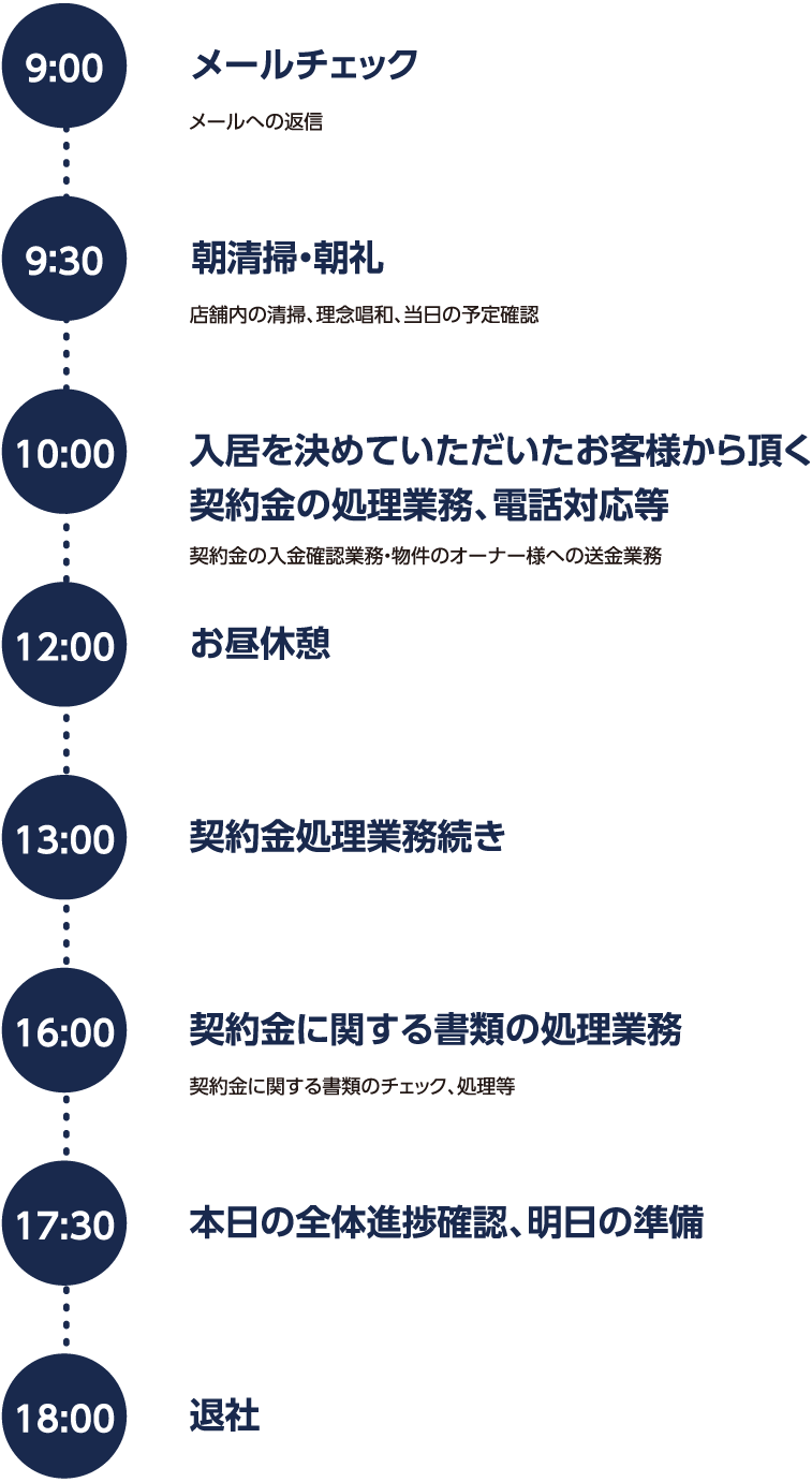 入居を決めていただいたお客様からの契約金処理業務を中心に行っています。主な業務は、契約者様からの入金確認や、オーナー様への送金業務、電話対応等があります。お金に携わる業務ですので、一円たりともミスや間違いが許されません。日々の業務は緊張の毎日ですが、確認作業を怠らず慎重に取り組んでいます。契約者やオーナー様と直接関わる機会は少ないのですが、契約金を処理することで、橋渡しができ、人と人の結びつきのお手伝いができることに喜び、やりがいを感じています。